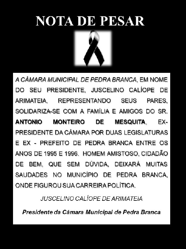 Faleceu o Sr. Antônio Monteiro de Mesquita, ex-presidente da Câmara Municipal de Pedra Branca, por duas legislaturas, e ex-prefeito deste município entre 1995 e 1996.